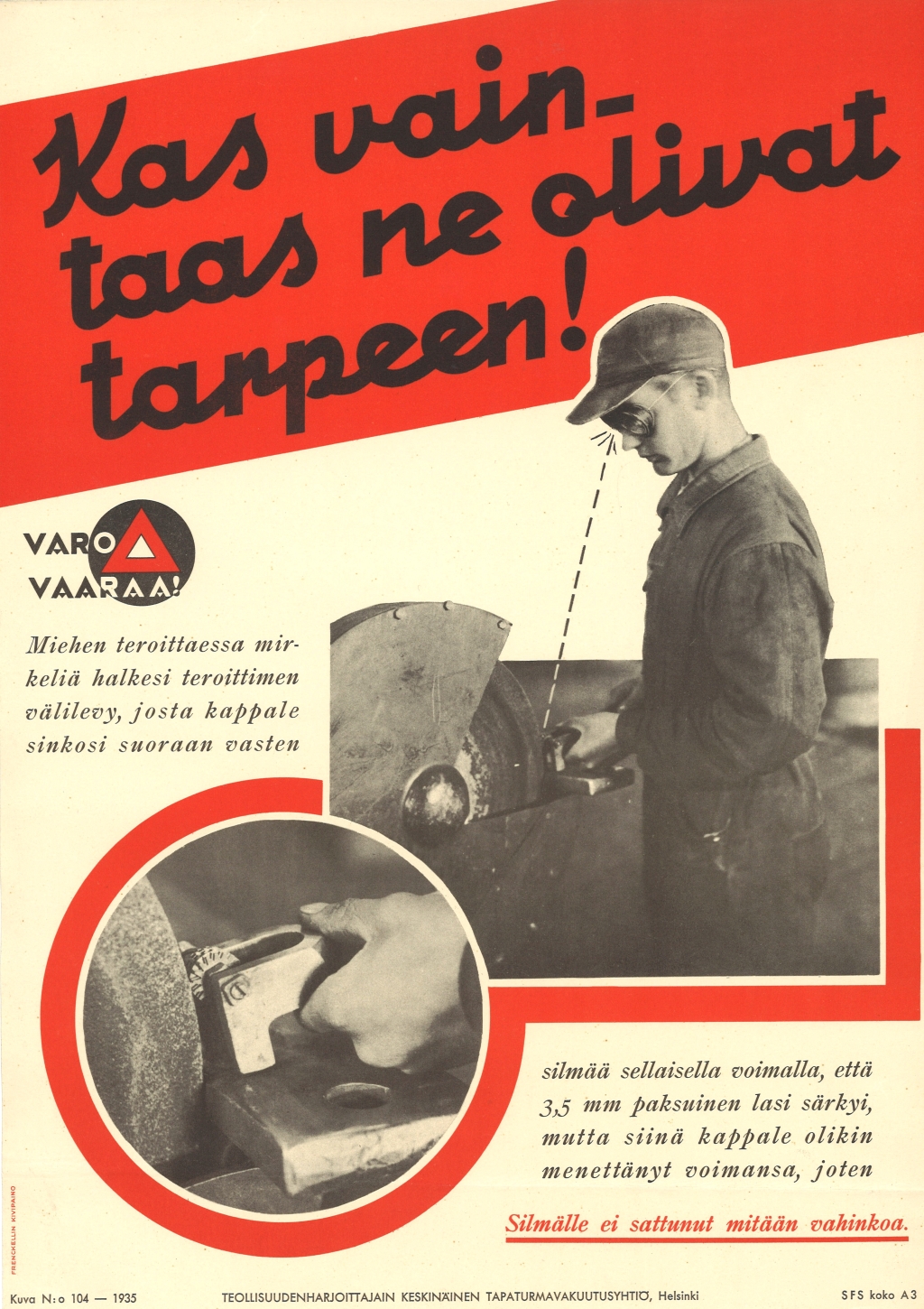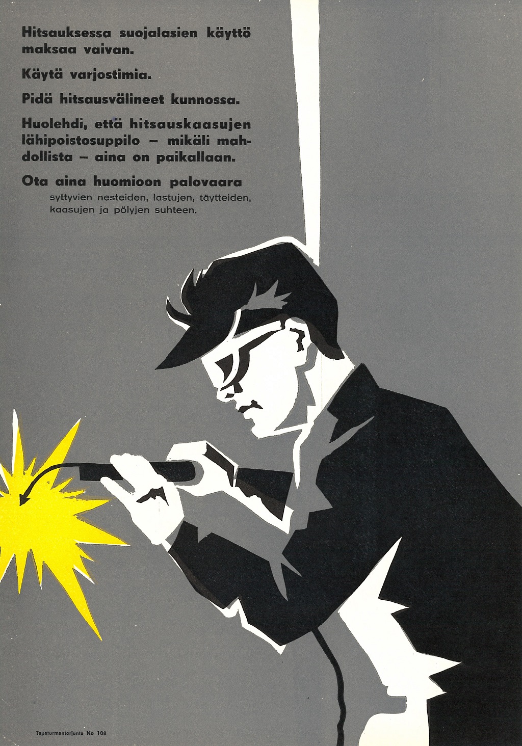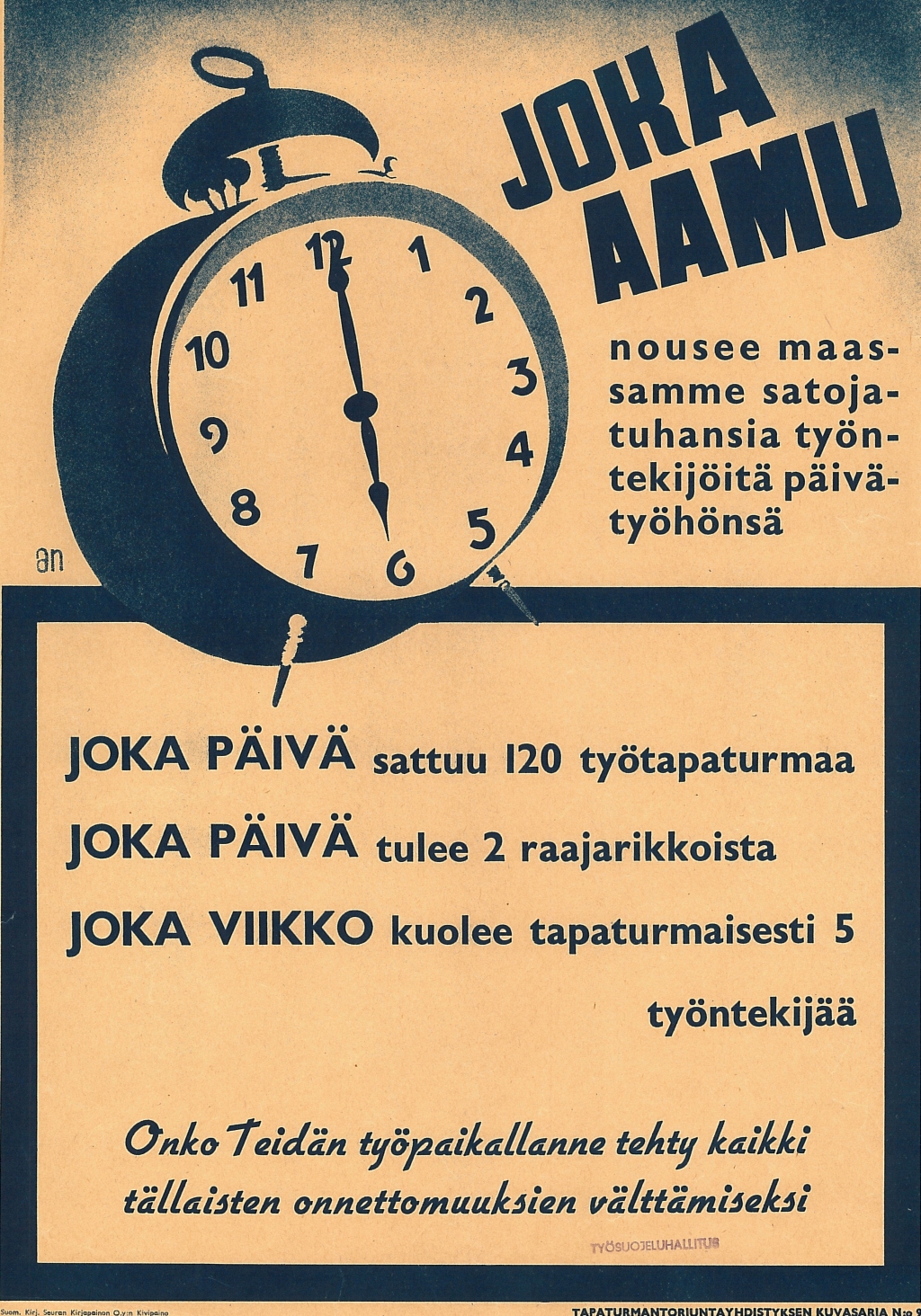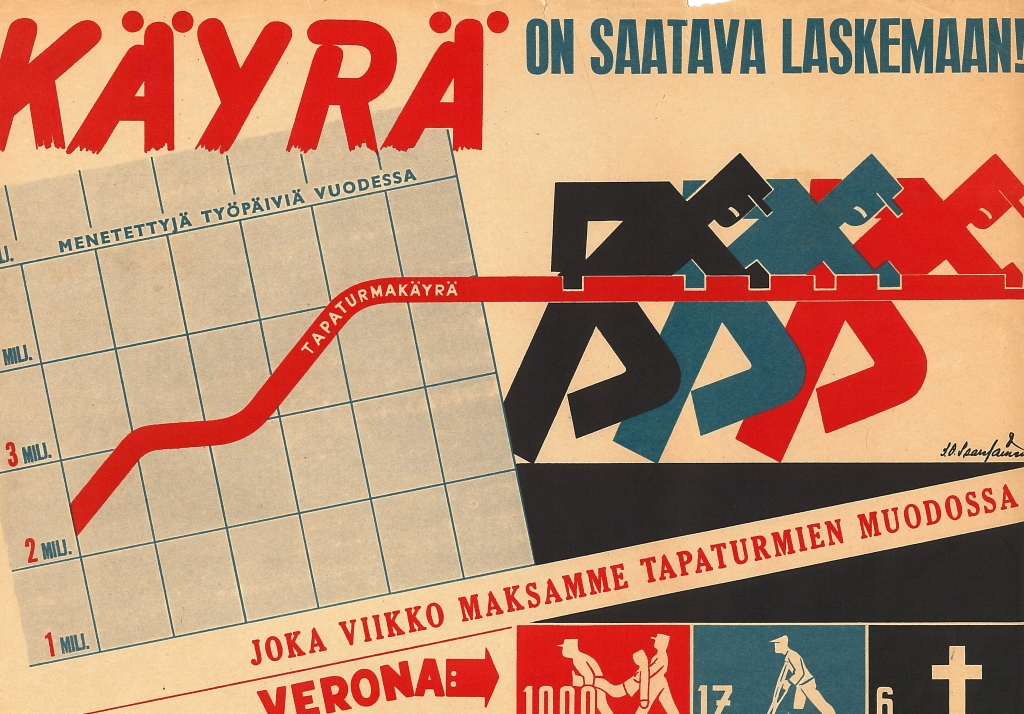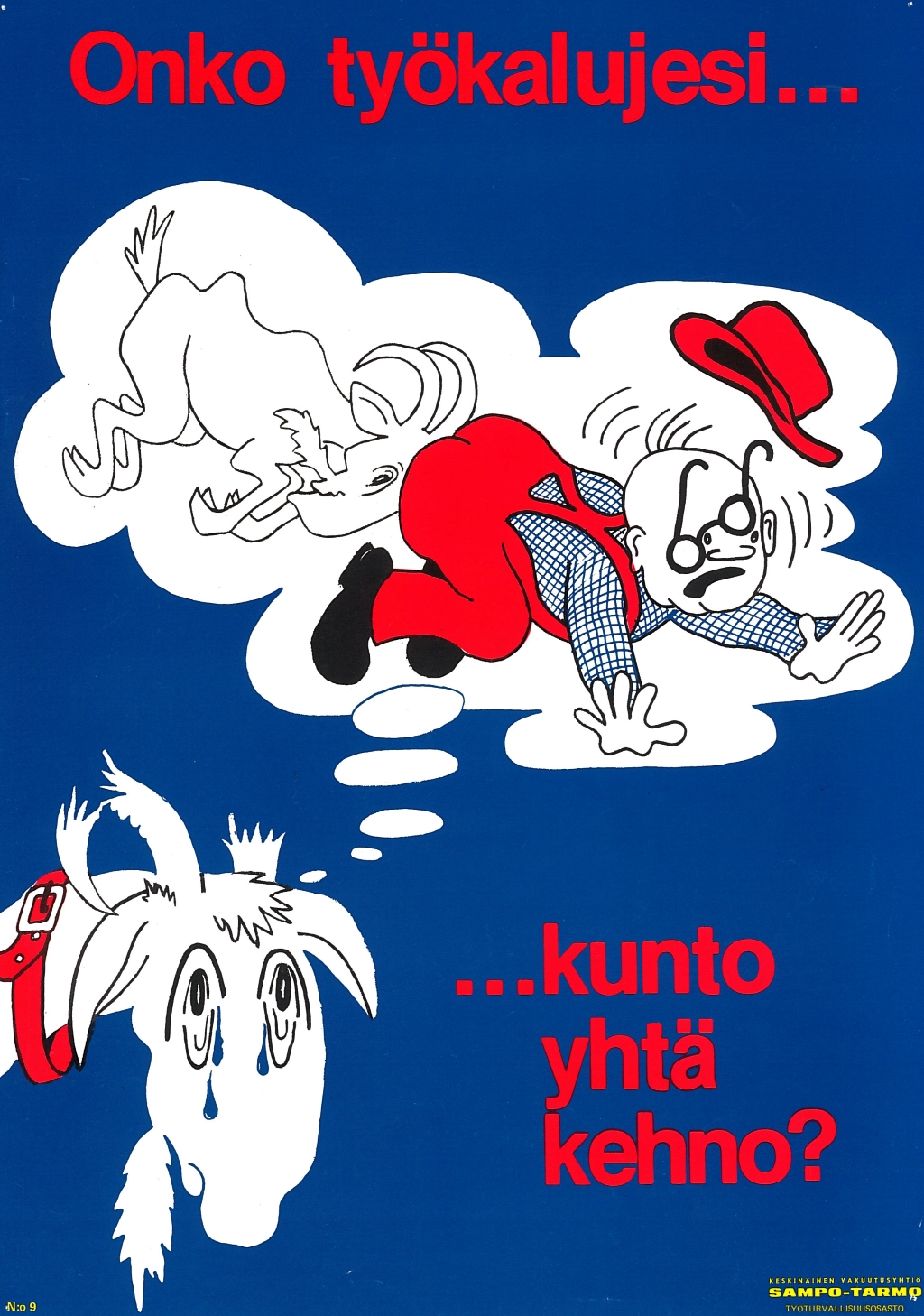 Näyttelyssä on julisteita 1930-luvulta alkaen. Julisteet kuvastavat oman aikakautensa keinoja, joilla pyrittiin parantamaan työsuojelua työpaikoilla. Julisteita ei saa ladata kaupalliseen käyttöön.