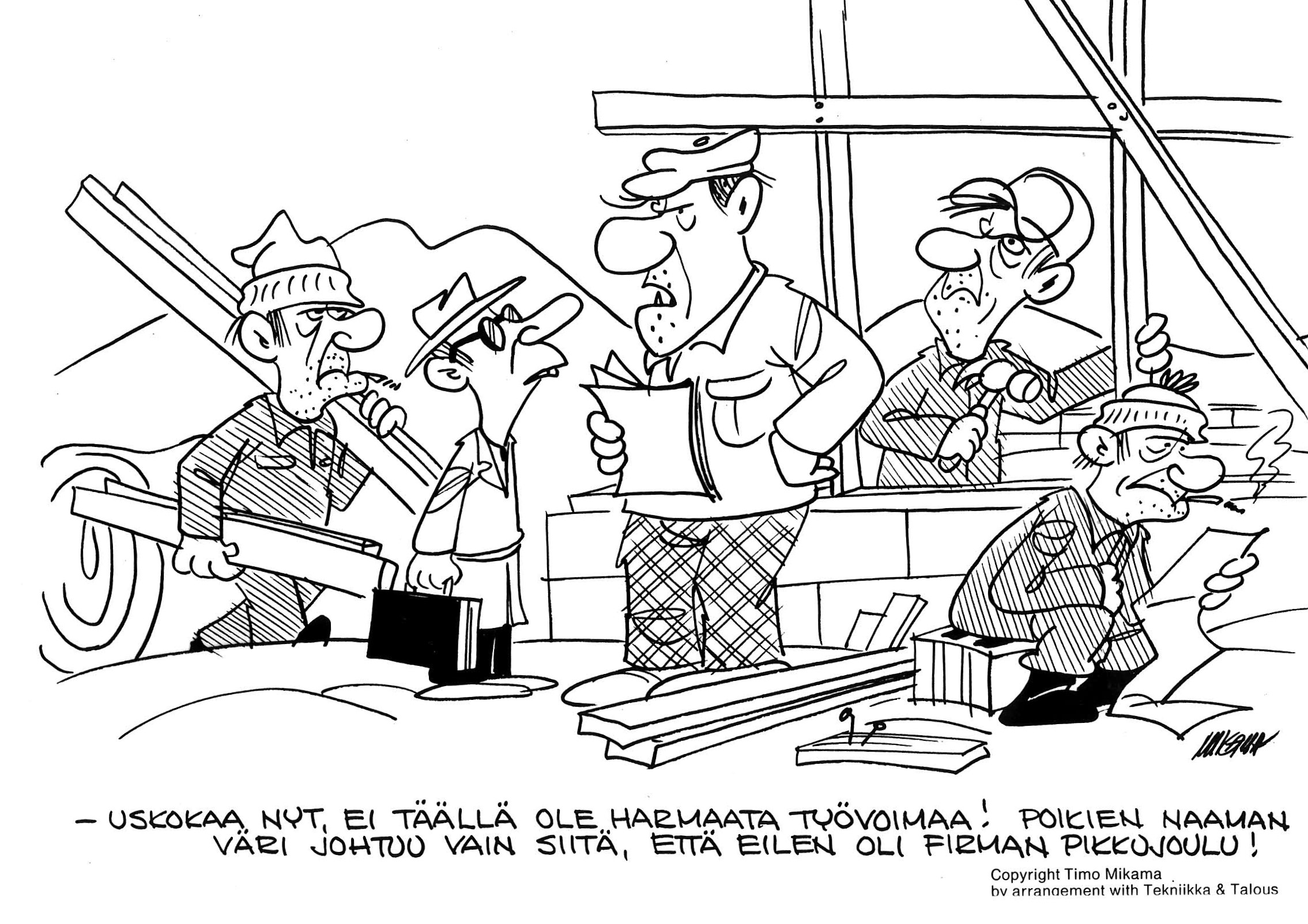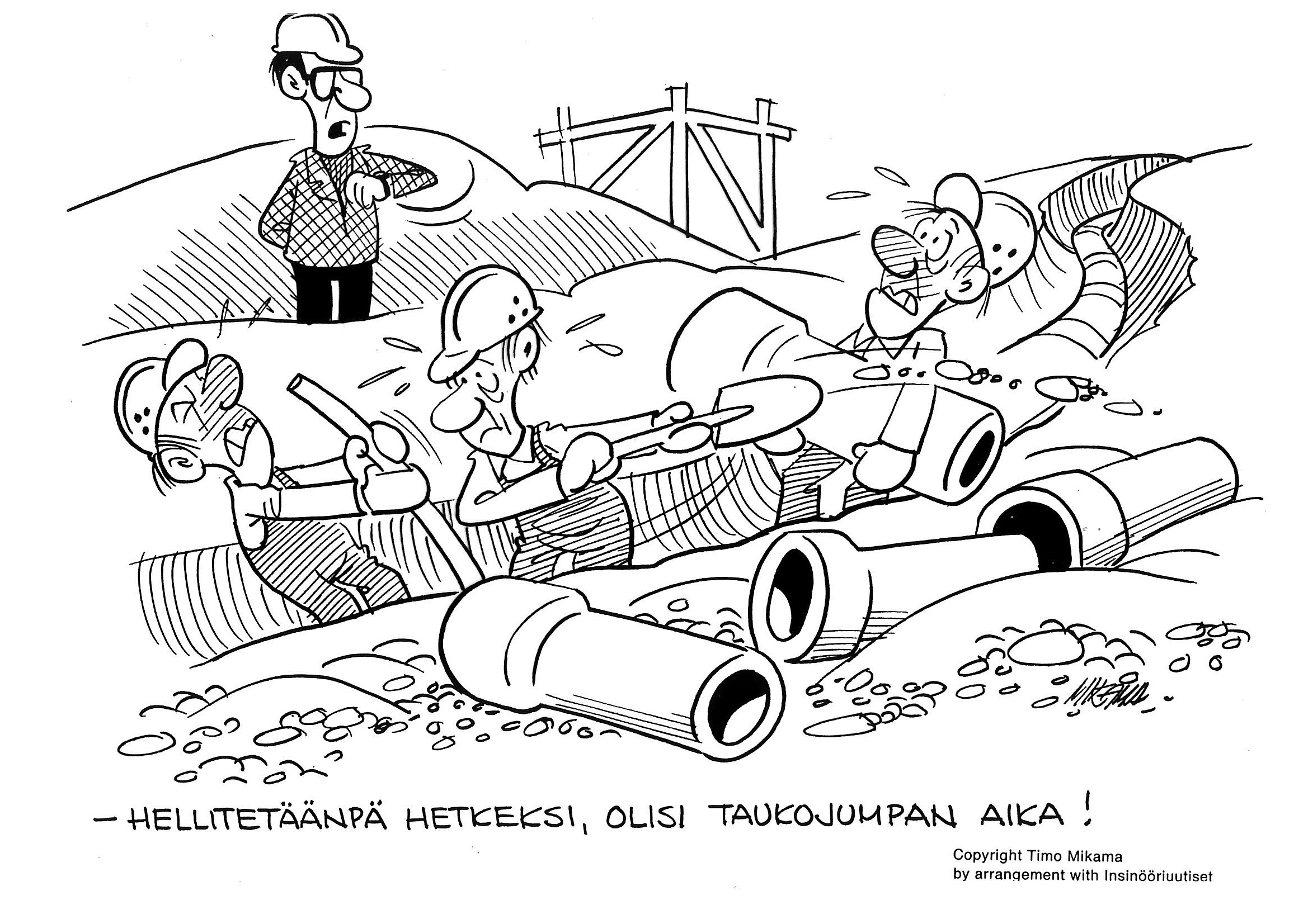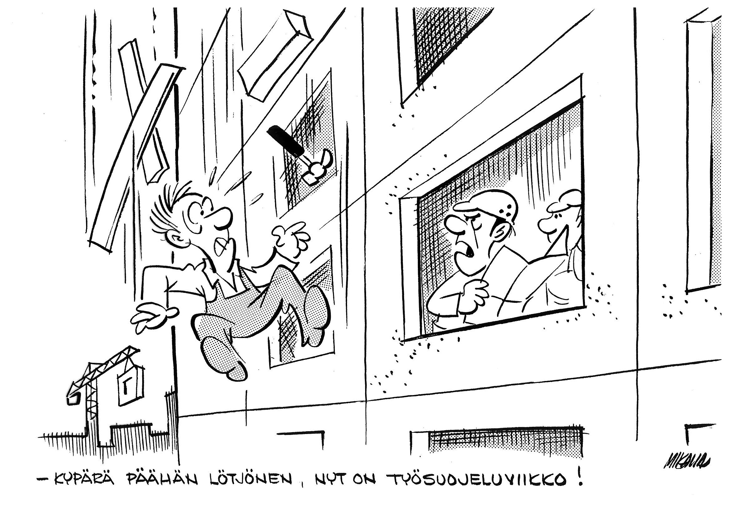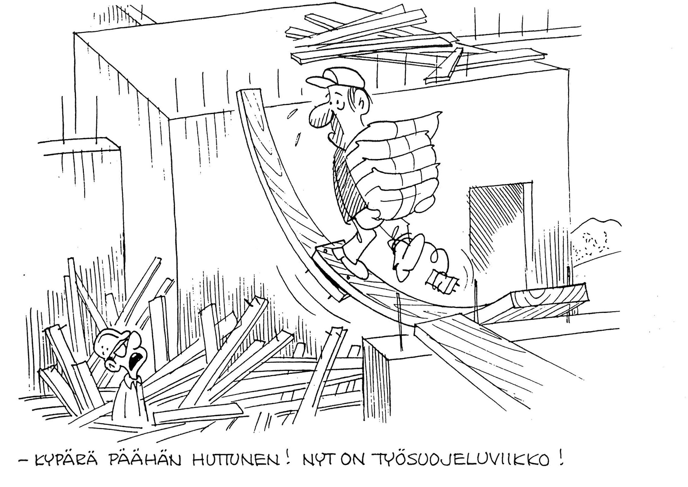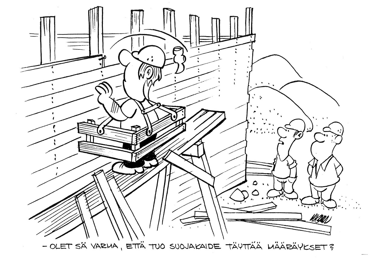 Timo Mikaman piirroksia. Teokset on julkaistu alunperin Tekniikka ja talous -lehdessä 1990-luvulla. Työsuojeluhallinnolla on teoksiin erillissopimuksella julkaisu ja käyttöoikeudet.