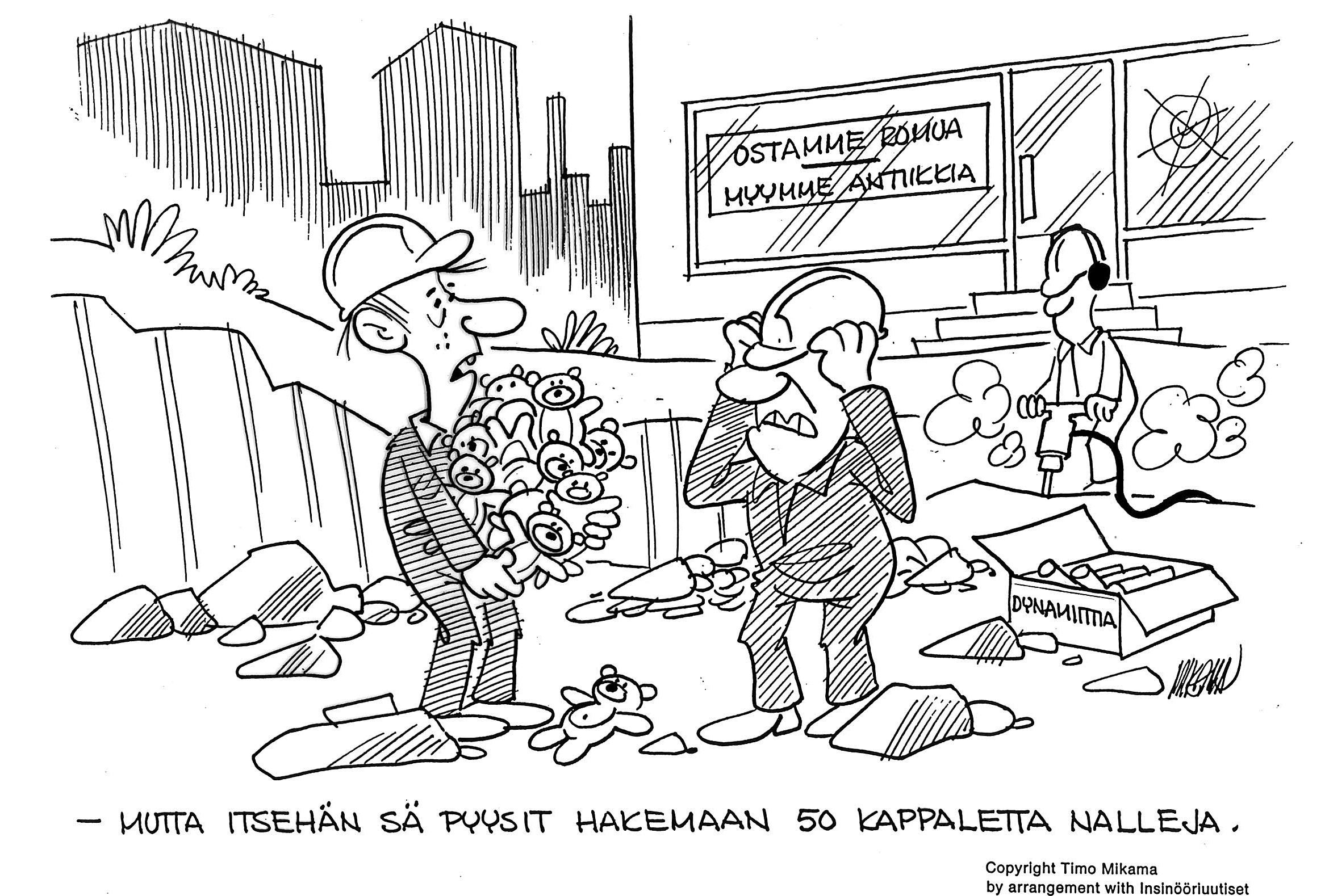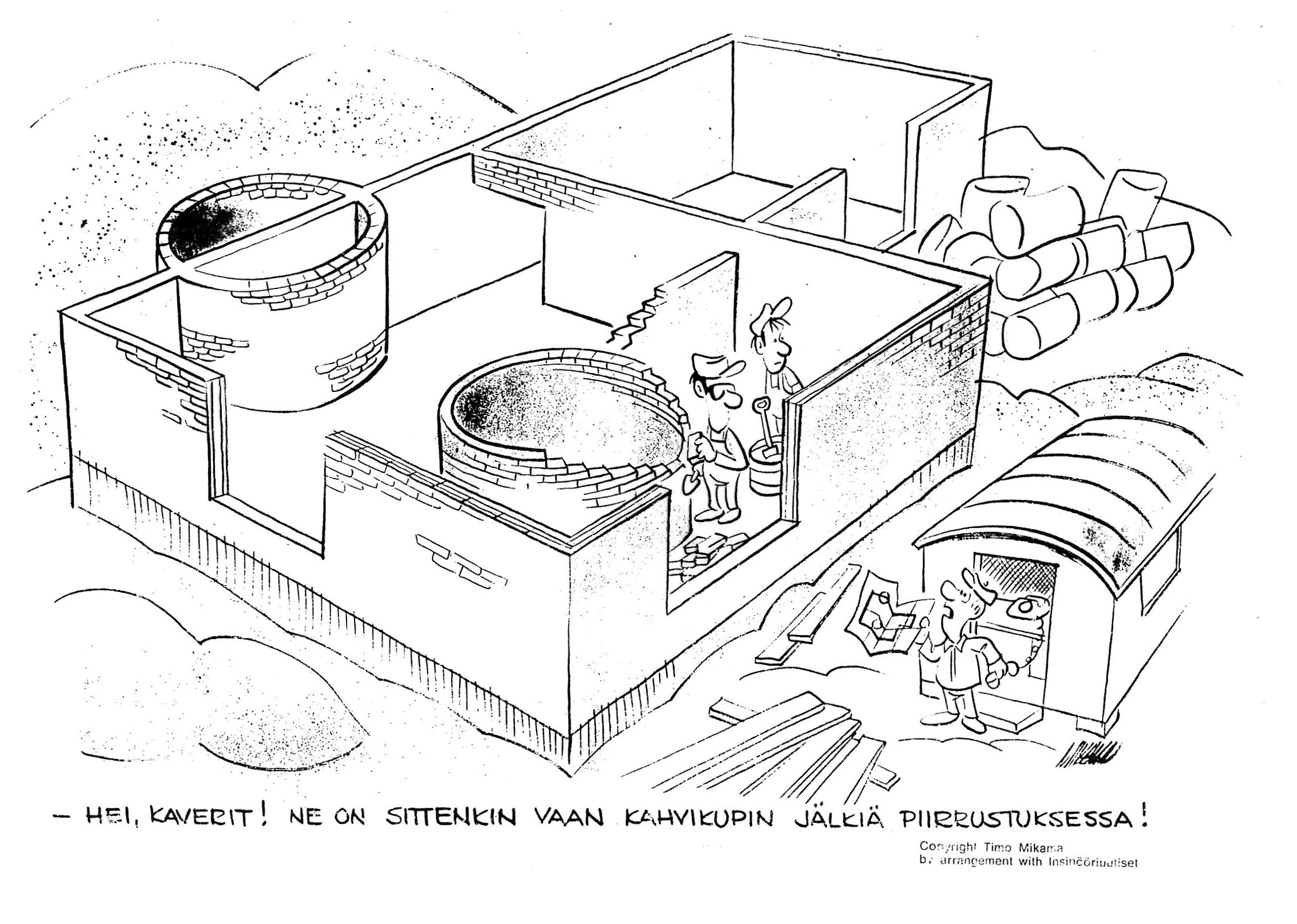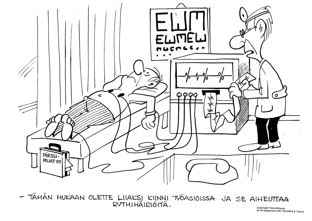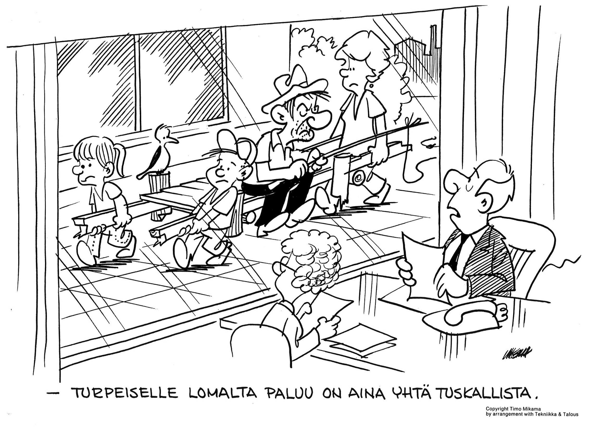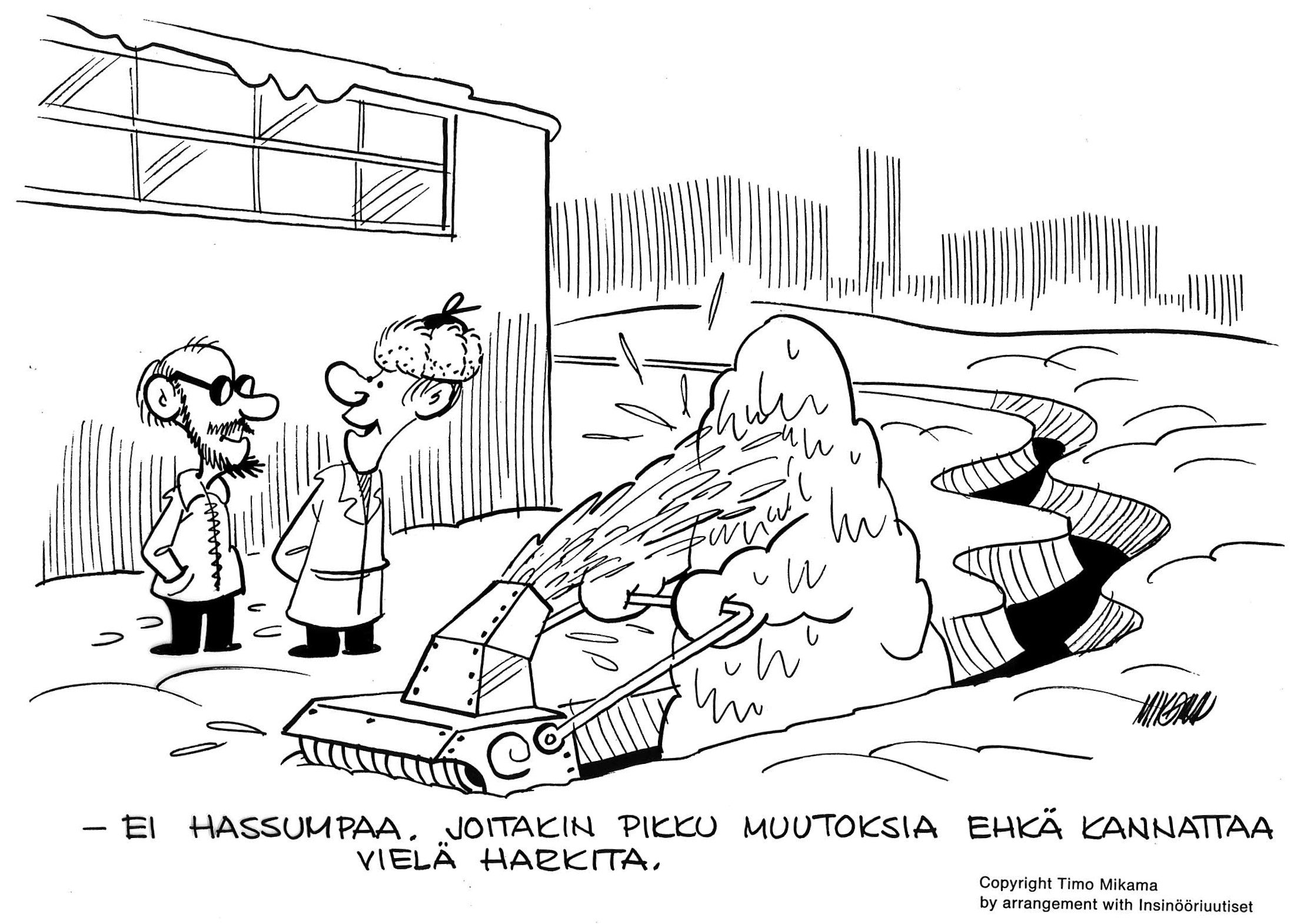 Timo Mikaman piirroksia. Teokset on julkaistu alunperin Tekniikka ja talous -lehdessä 1990-luvulla. Työsuojeluhallinnolla on teoksiin erillissopimuksella julkaisu ja käyttöoikeudet.